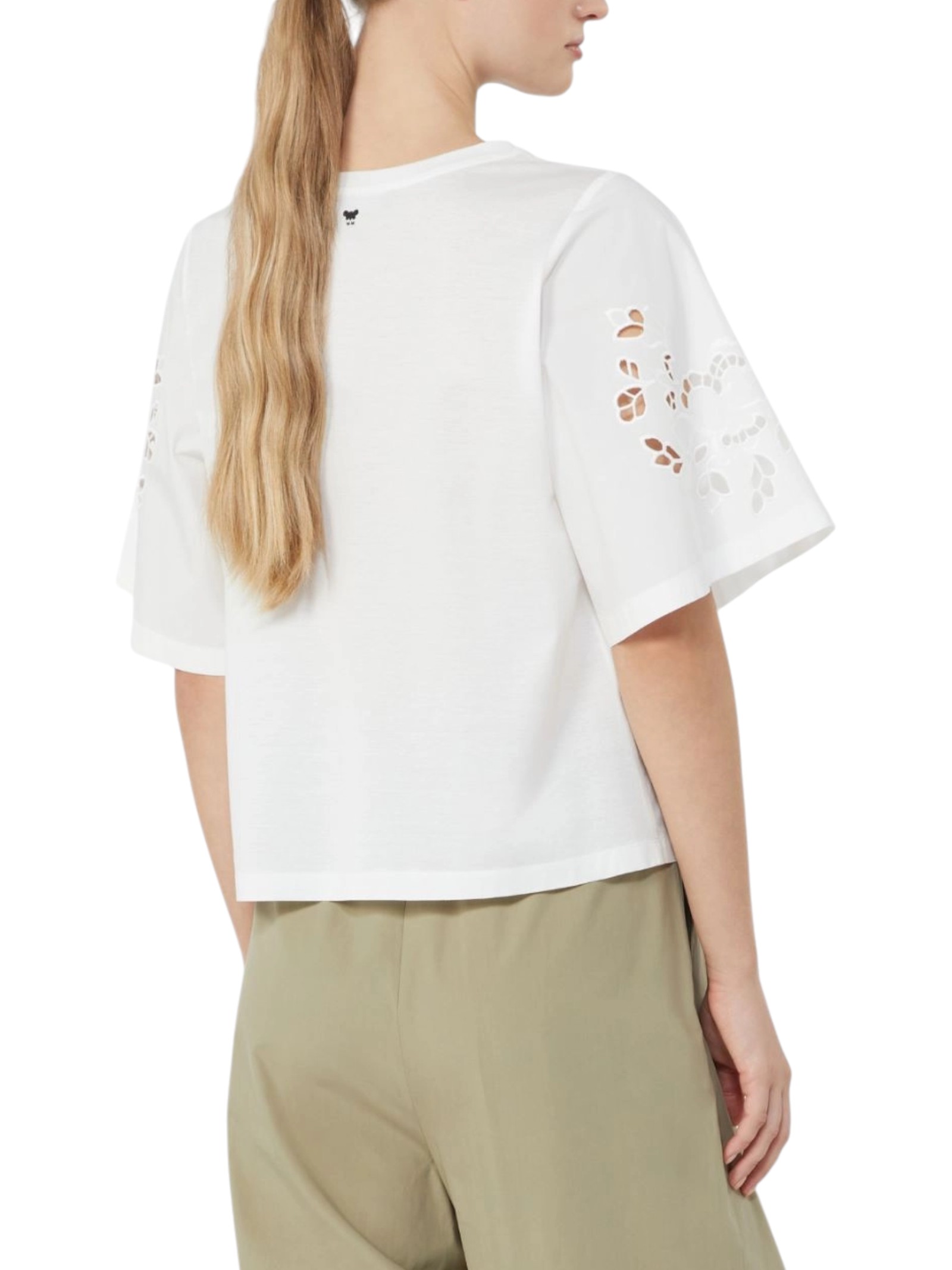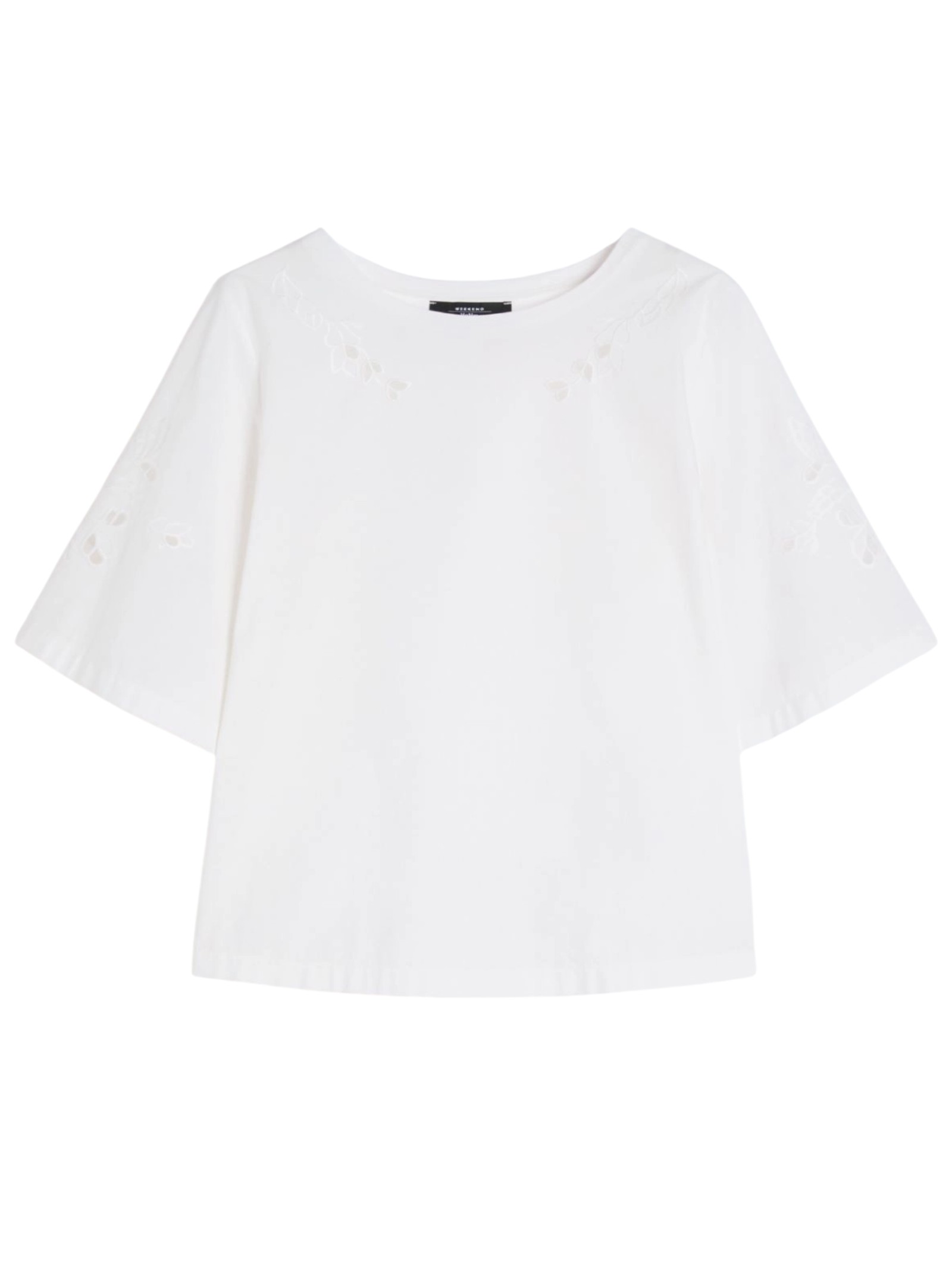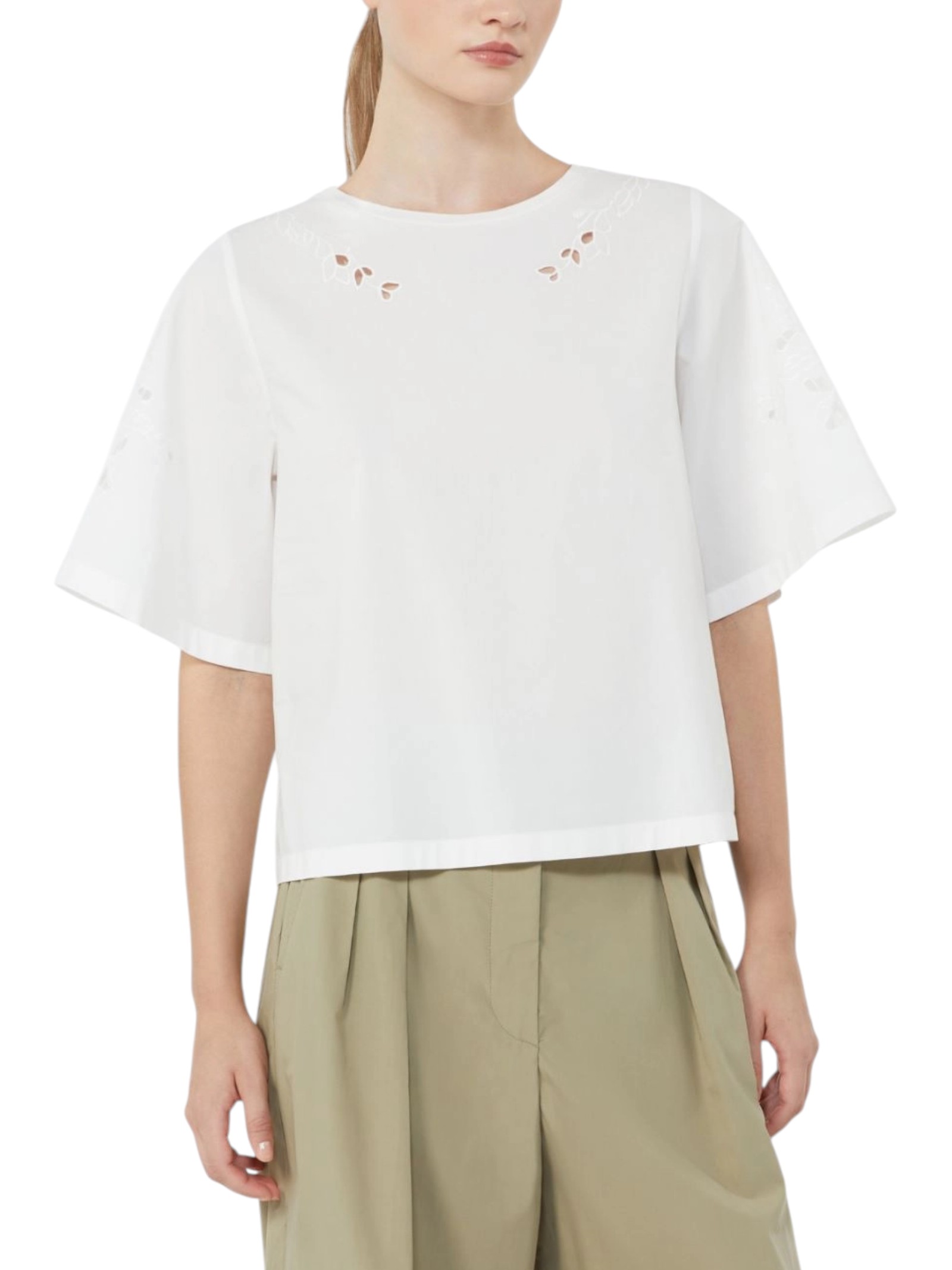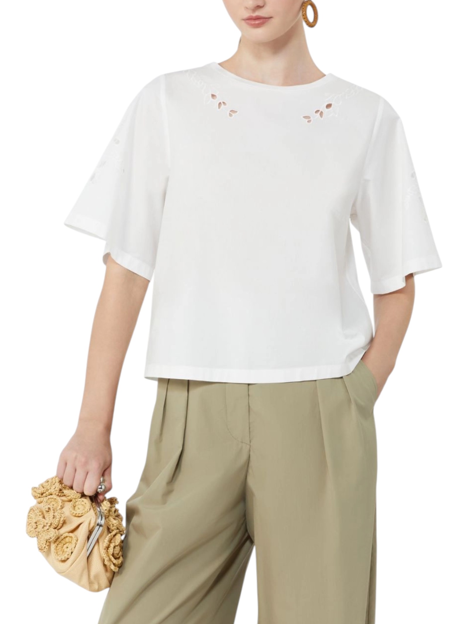 Top corto dalla linea dritta, impreziosito da motivo di ricami à jour sullo scollo davanti e le maniche.