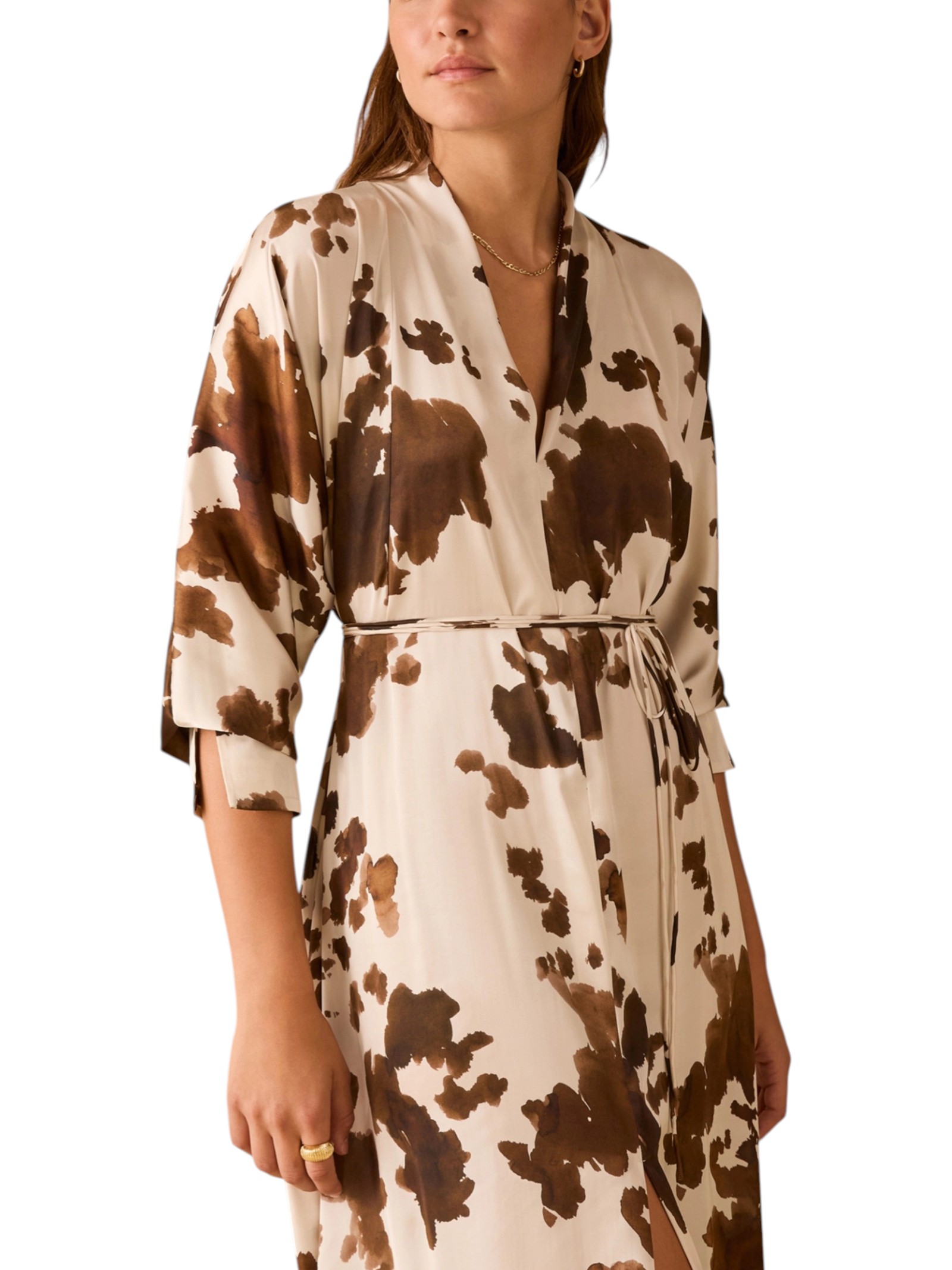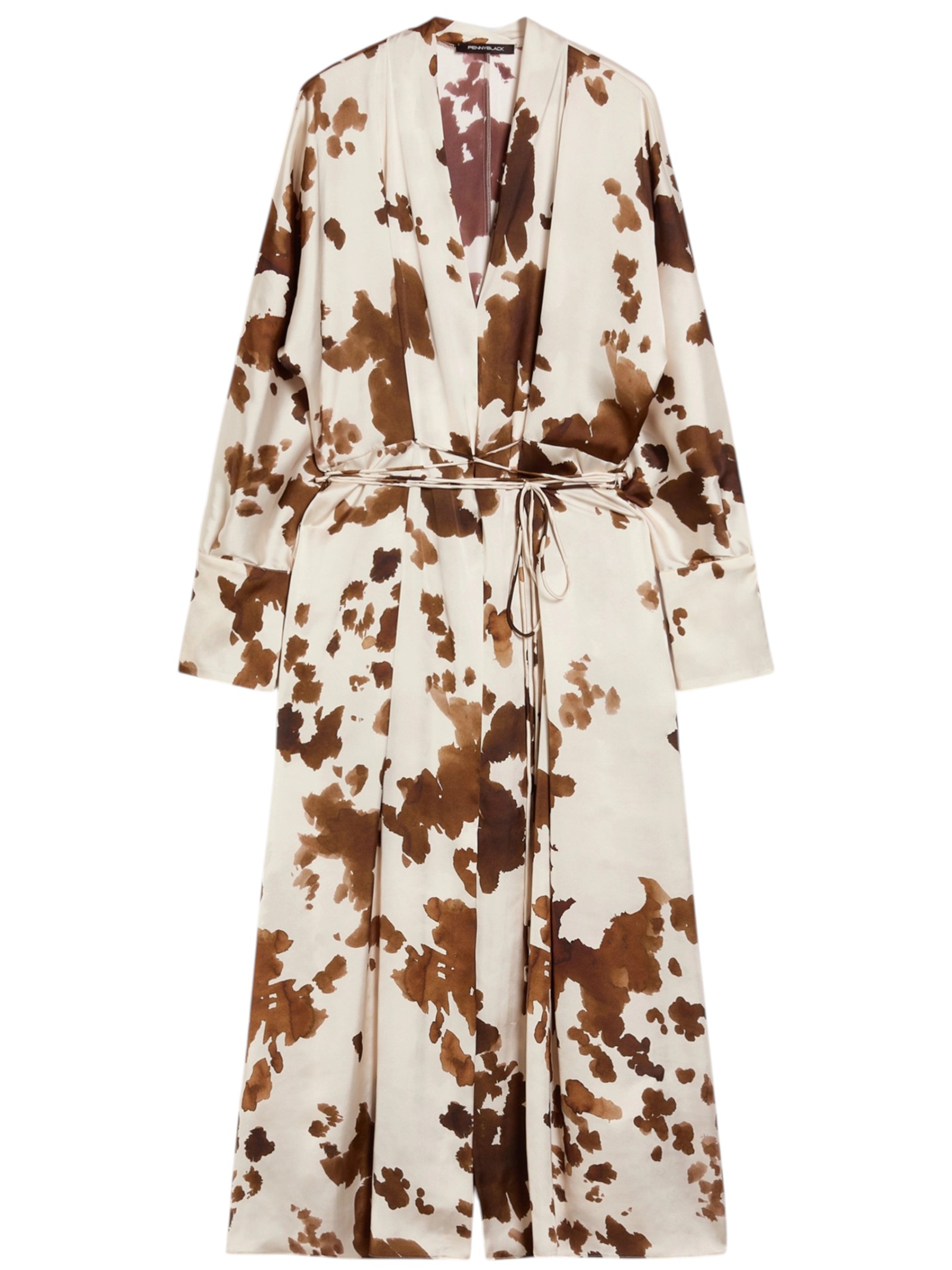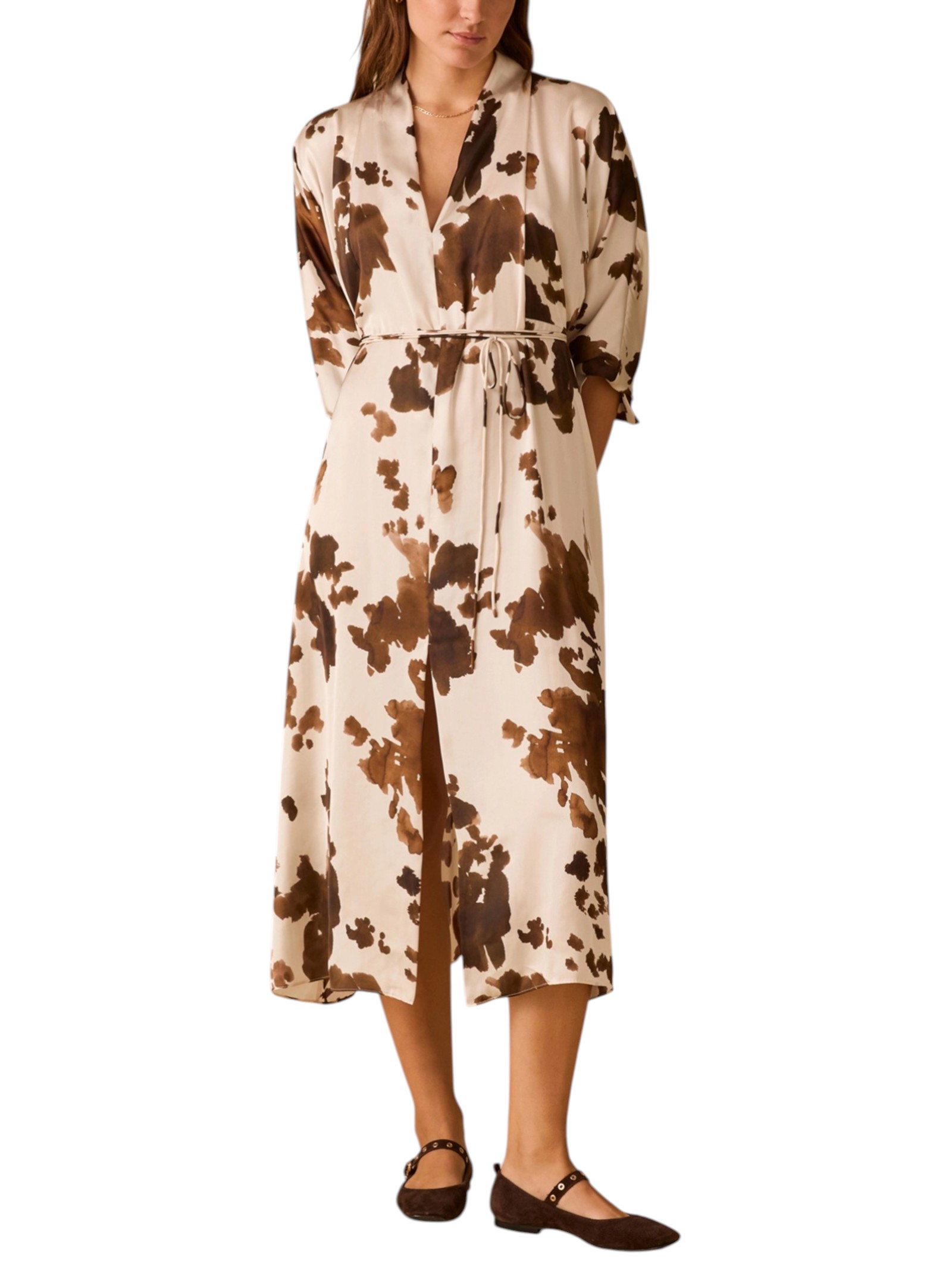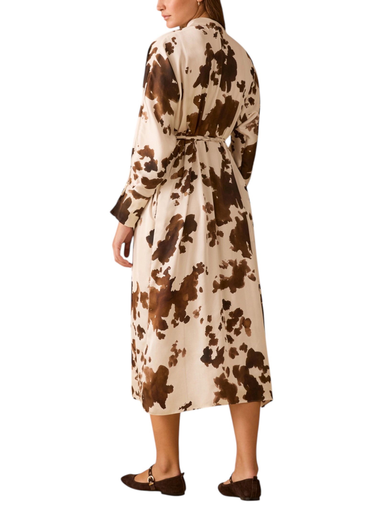 Con una silhouette fluida in raso lucente, questo abito a stampa cow reinterpreta atmosfere country in chiave chic.