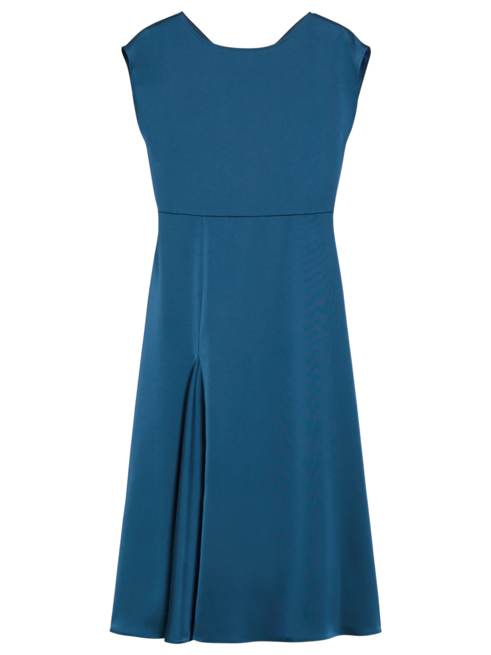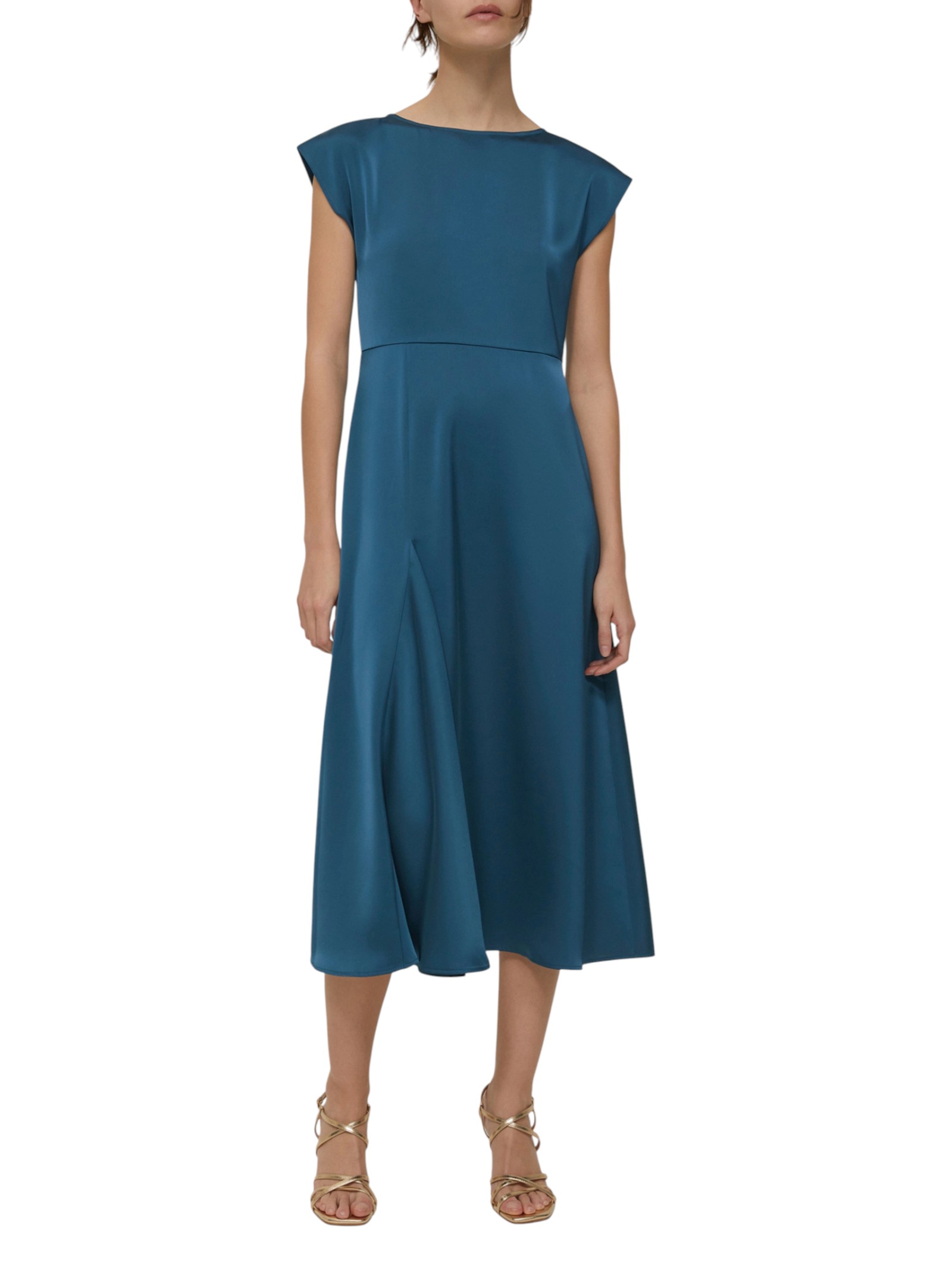 Labito midi in raso varia la sua eleganza classica grazie a un dettaglio asimmetrico che dona movimento alle linee fluide.