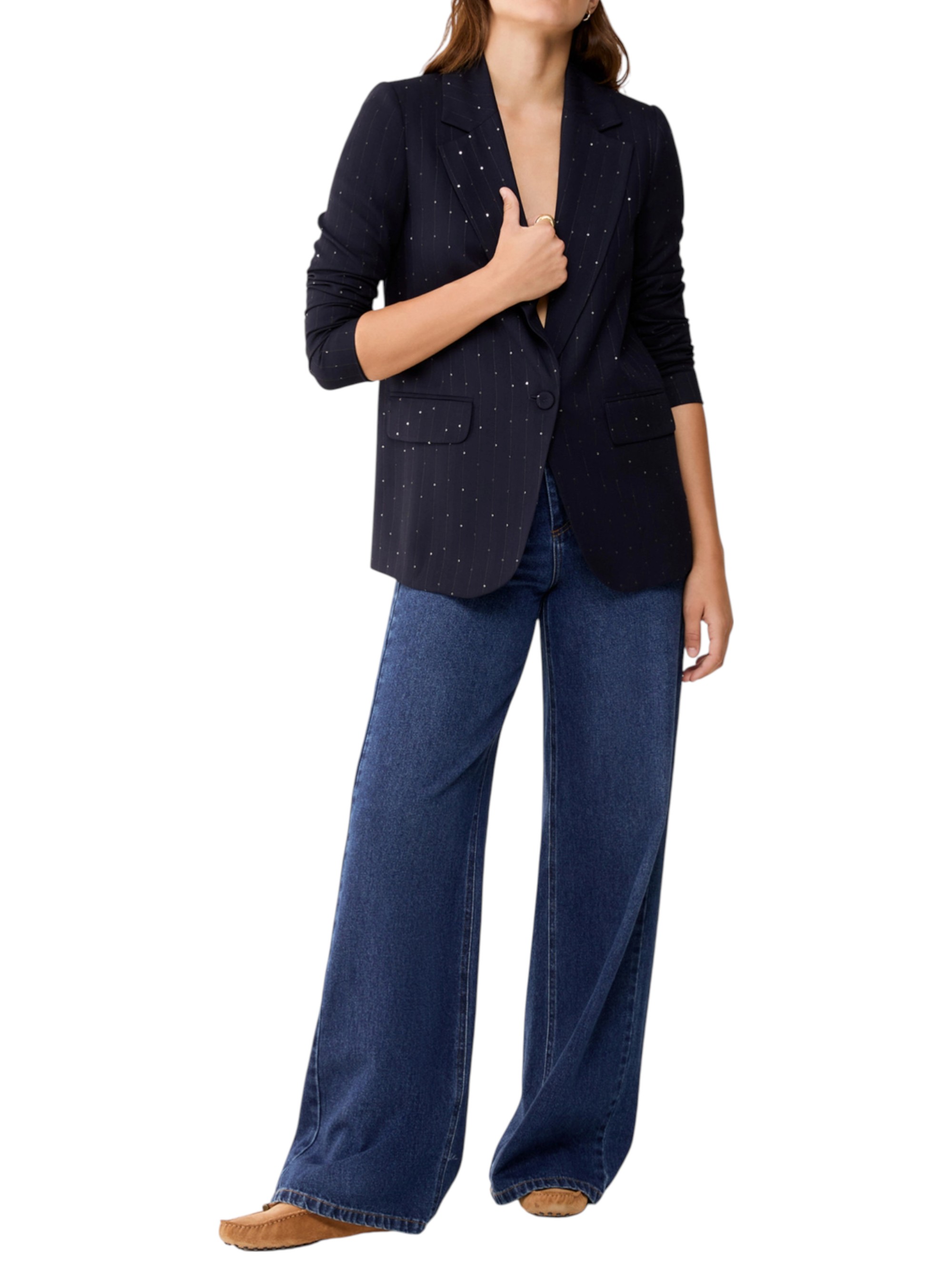 Arricchito da micro-paillettes, questo blazer gessato aggiunge un pizzico di glamour alla sua eleganza classica ed entra da protagonista nel guardaroba per le occasioni speciali.