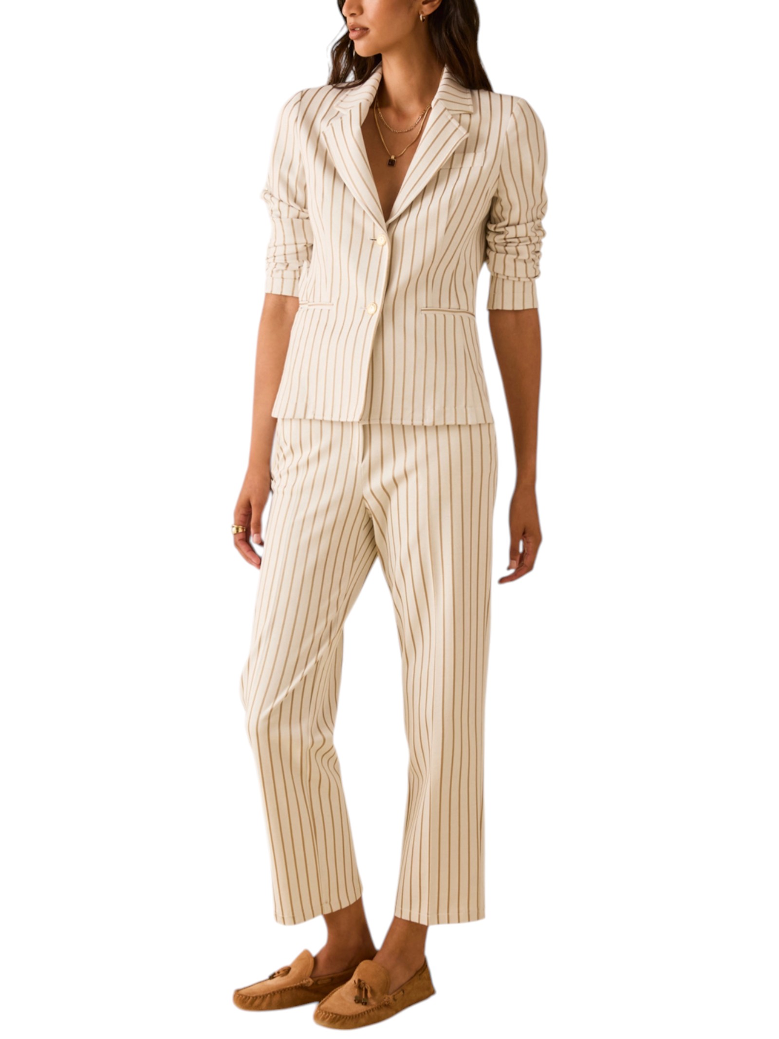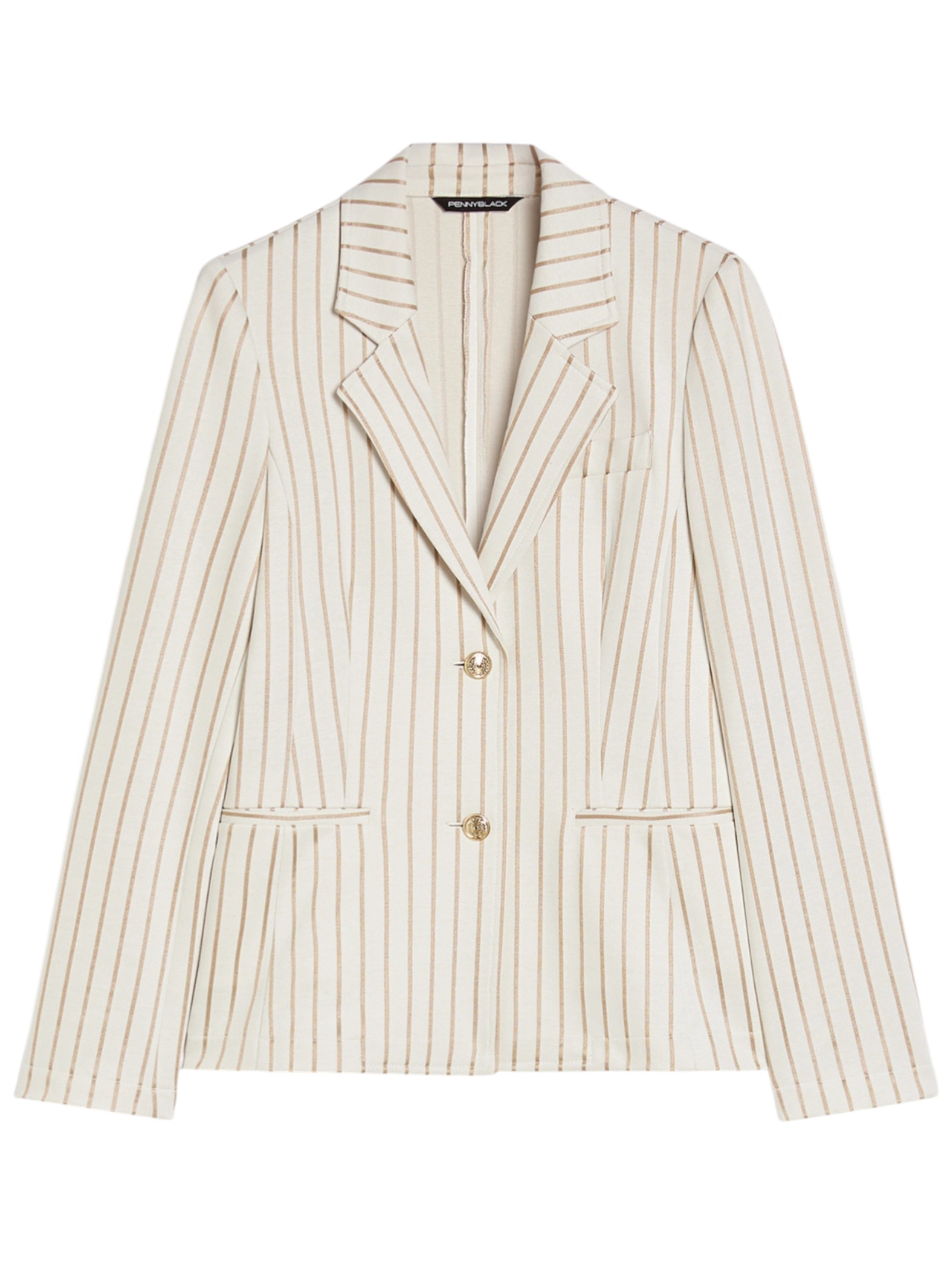 Con una silhouette femminile in confortevole jersey stretch, questo blazer a disegno gessato lucido su fondo opaco interpreta lo stile sartoriale classico in chiave contemporanea.