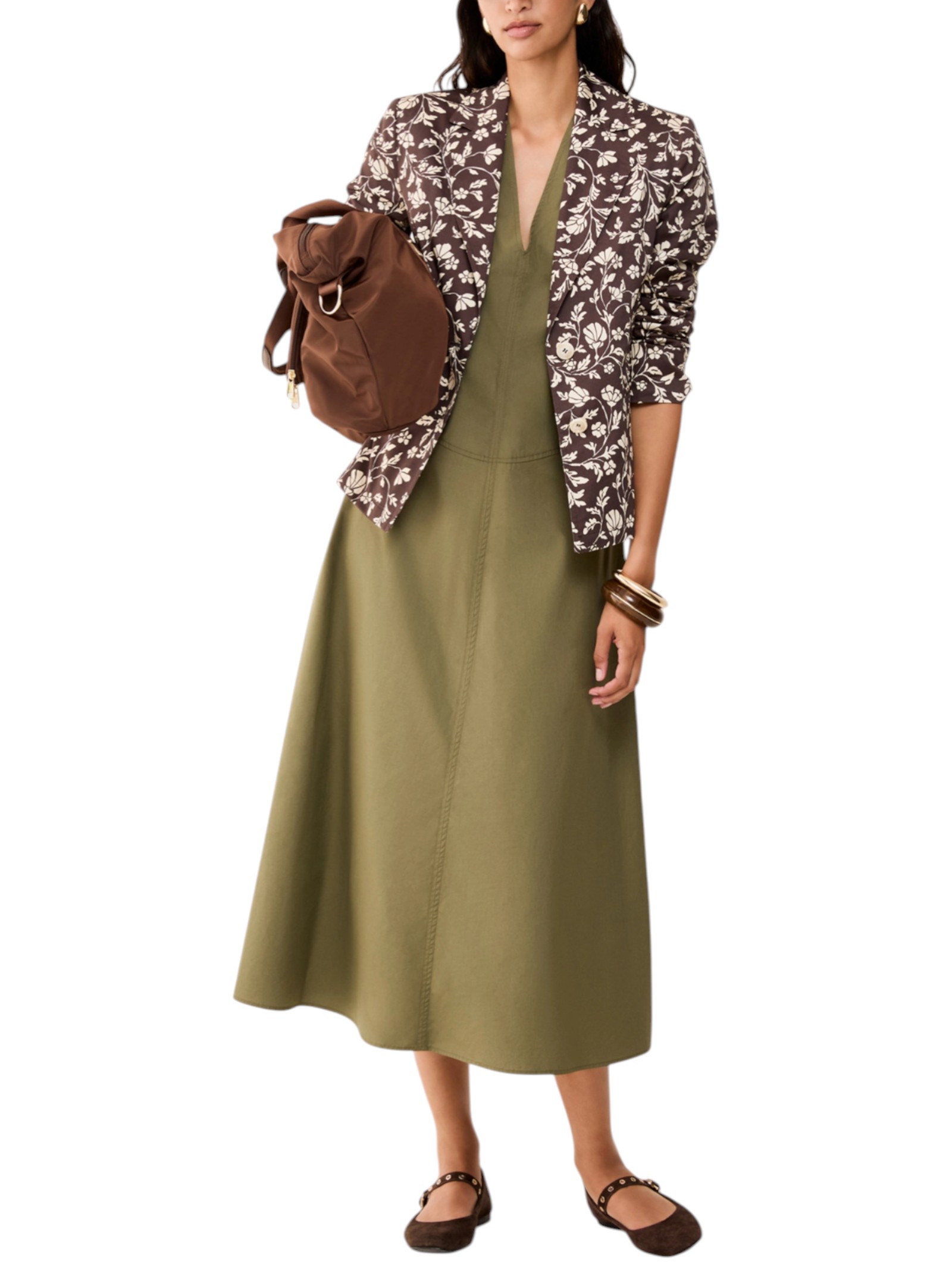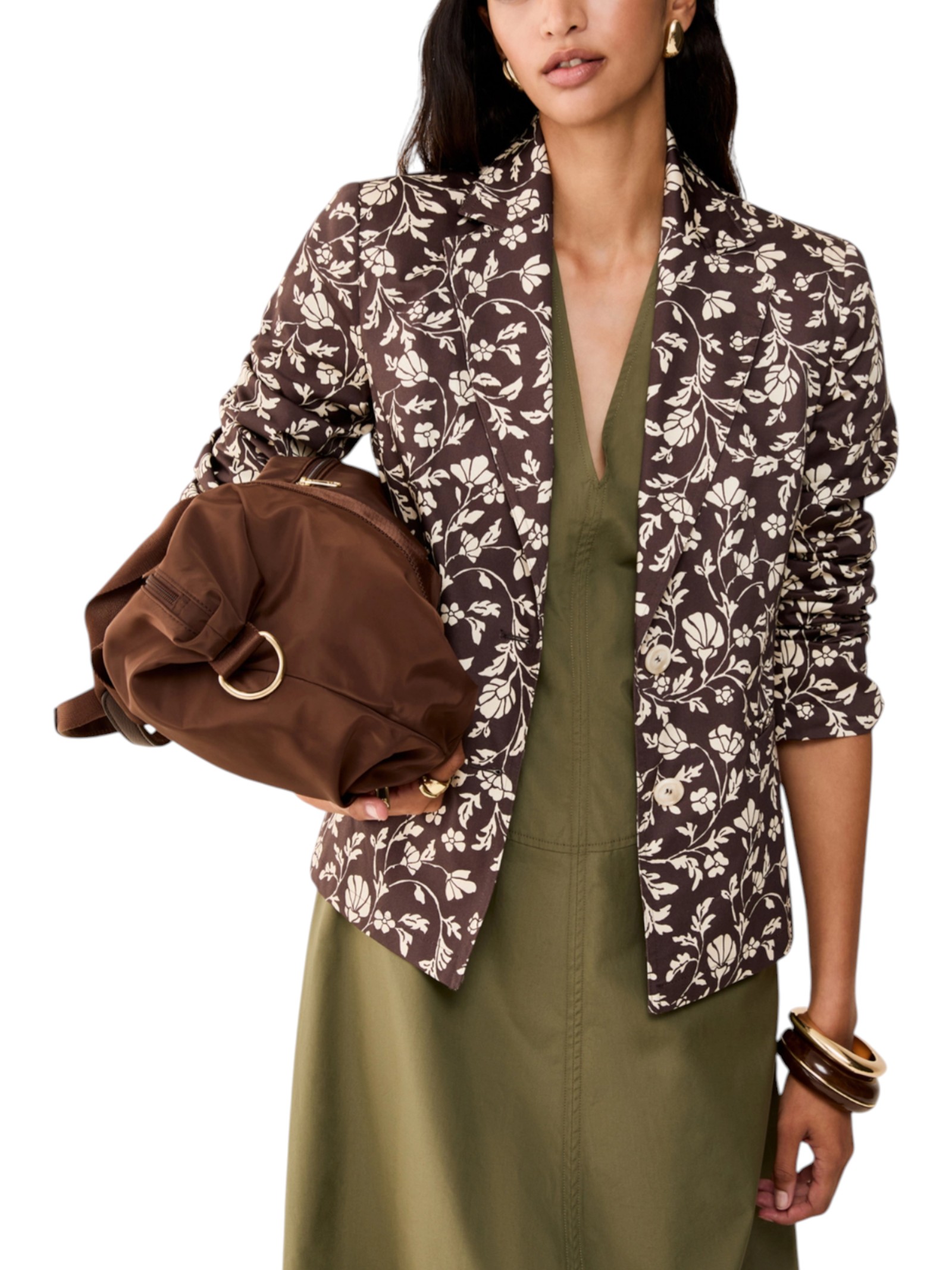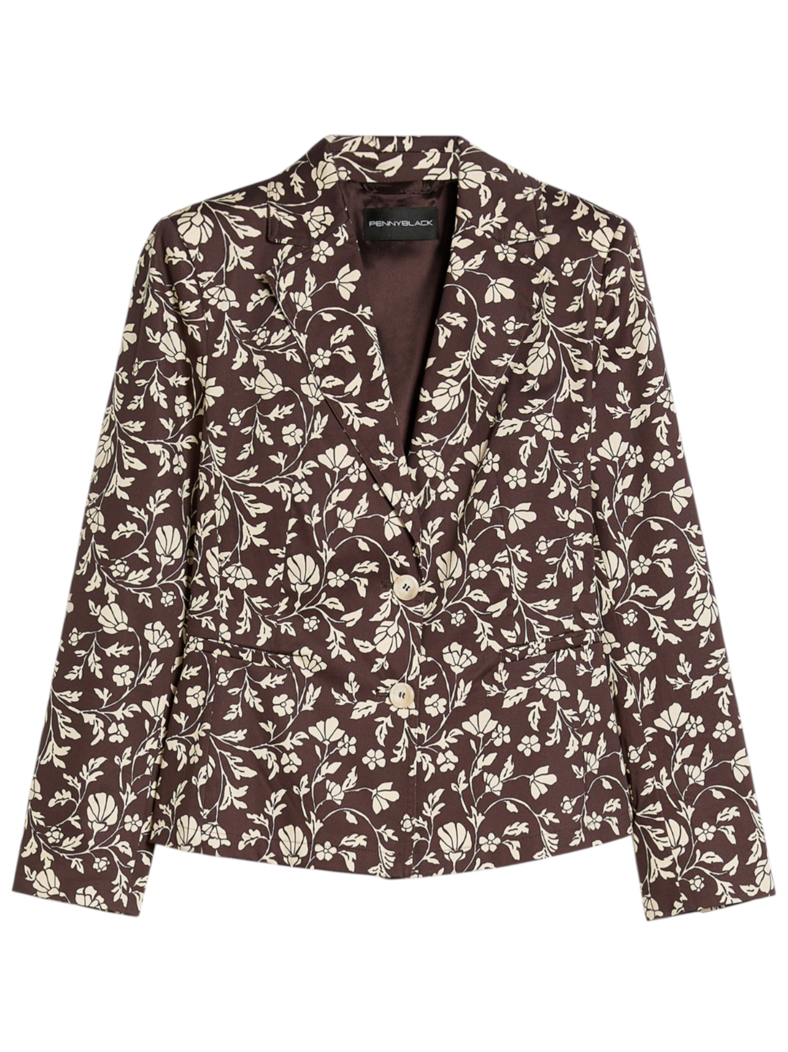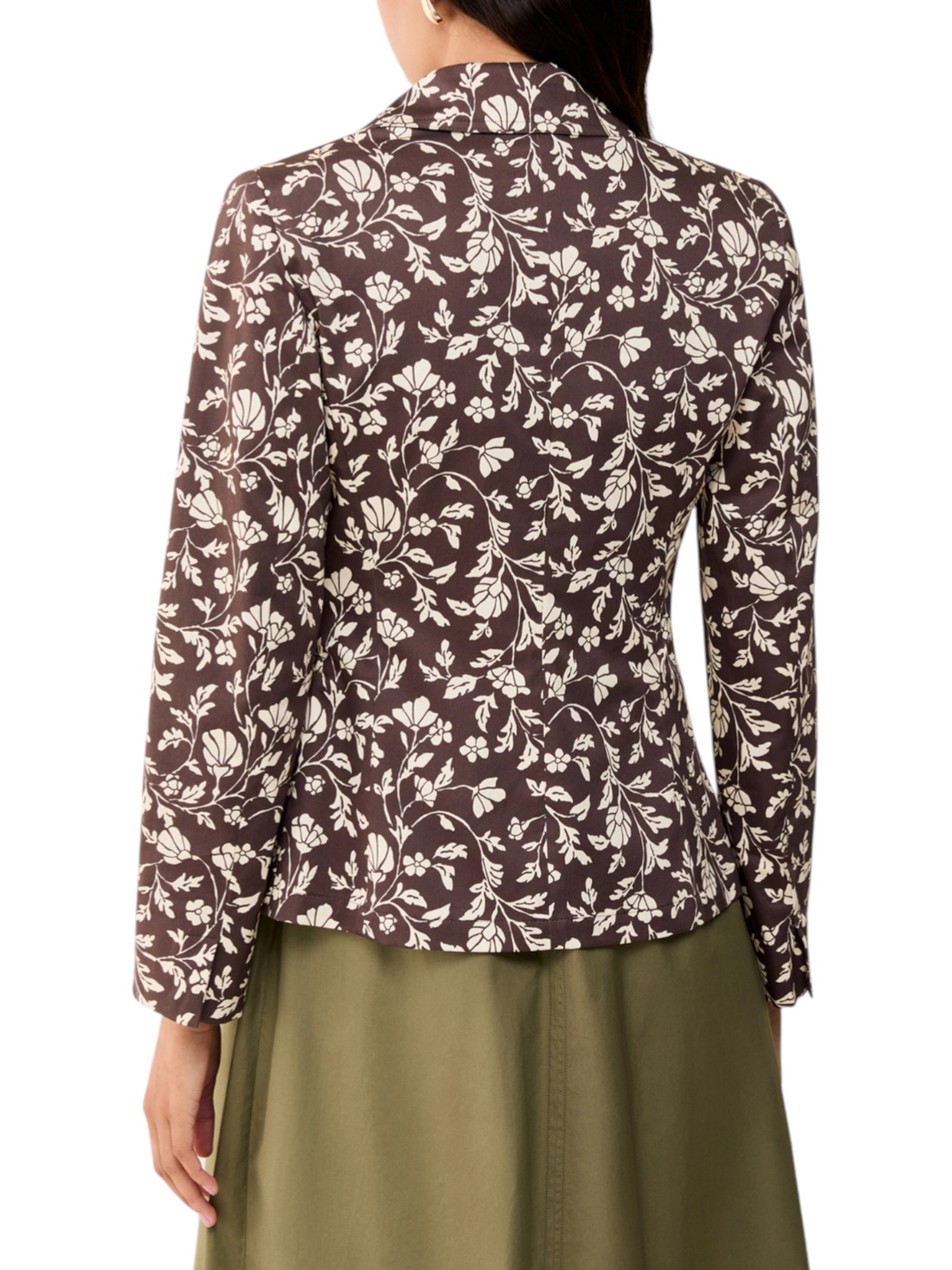 Ramages floreali reinterpretati in chiave grafica arricchiscono la silhouette femminile di questo blazer in raso di cotone: perfetto per dare una svolta al look.