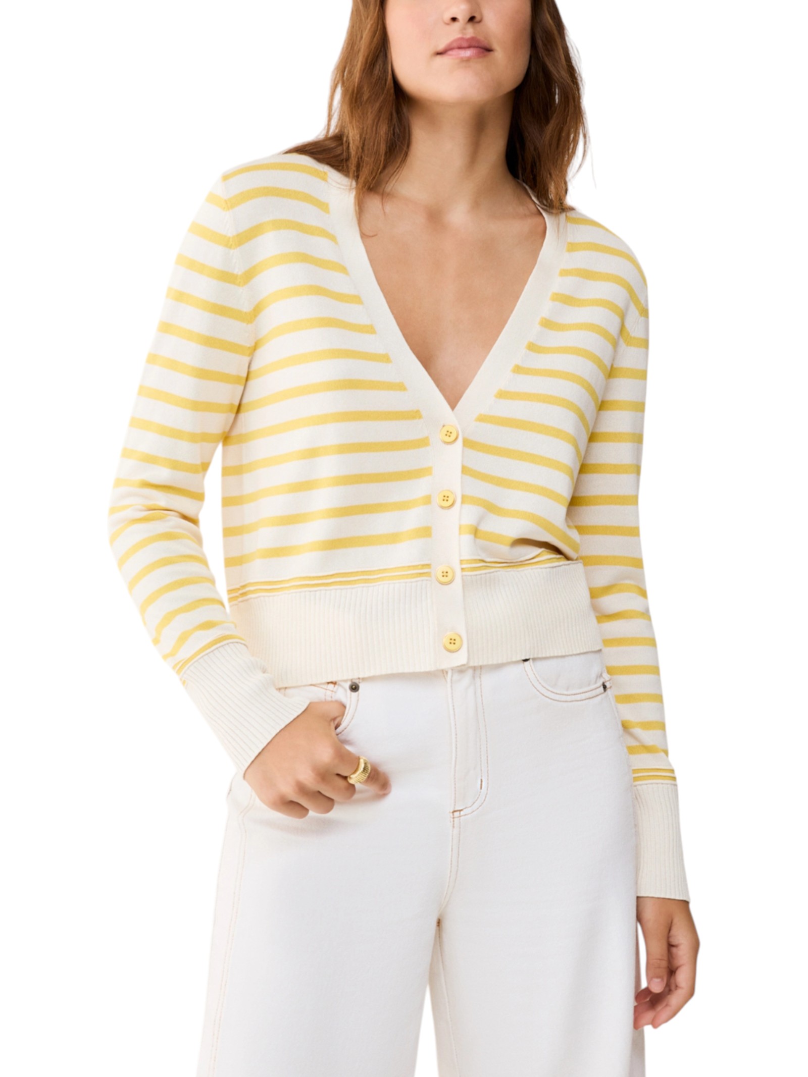 Per accompagnare il passaggio verso giorni più caldi, questo cardigan unisce la freschezza naturale del cotone, la fluidità della viscosa e un tocco lucente di seta.