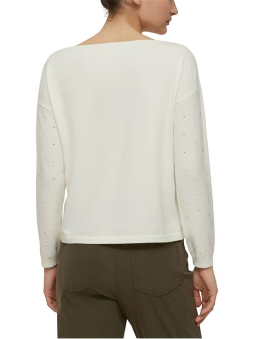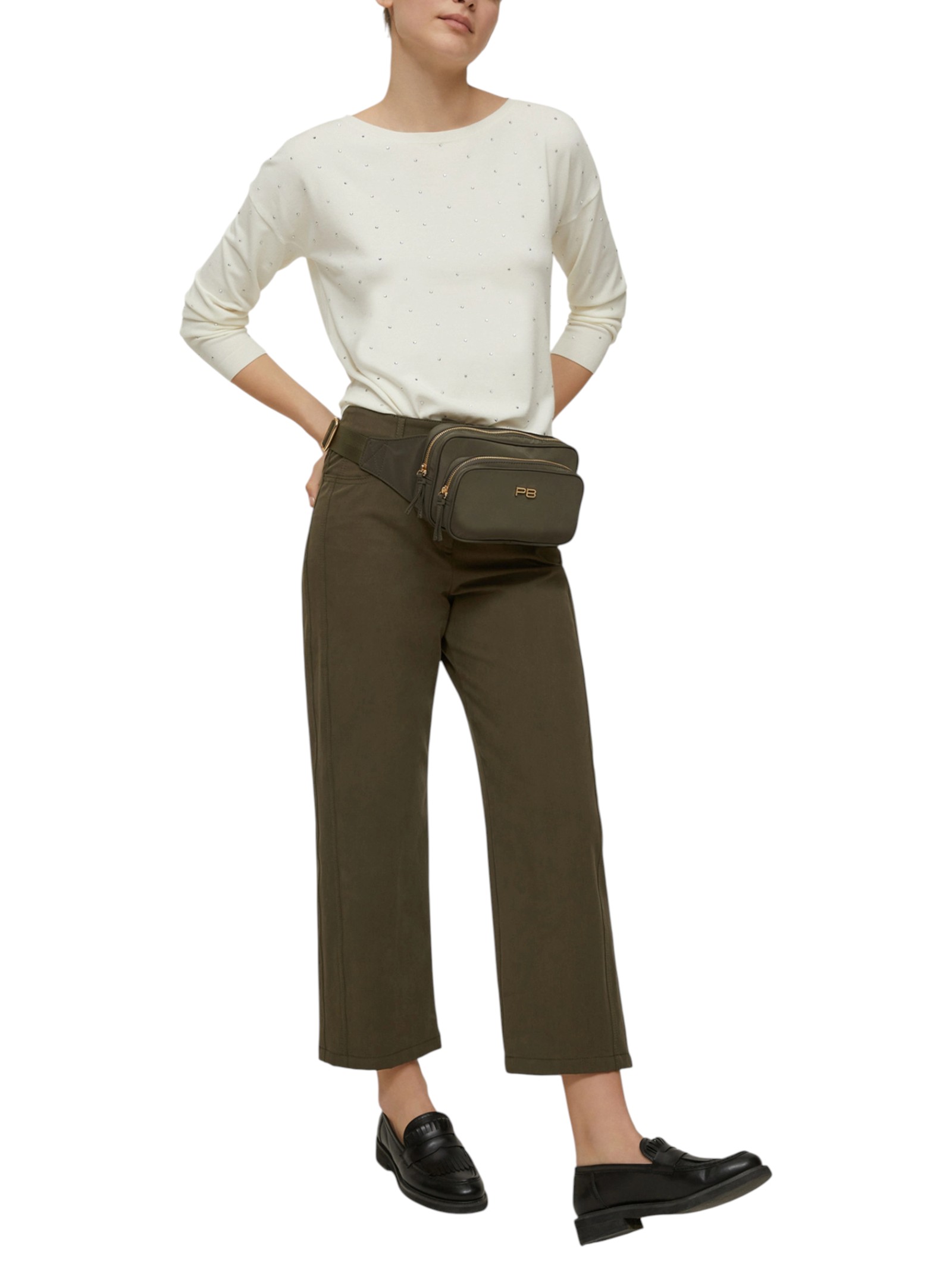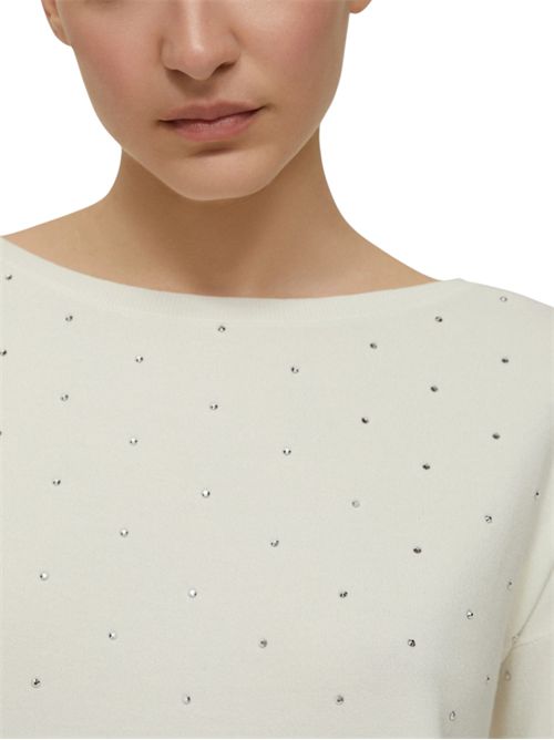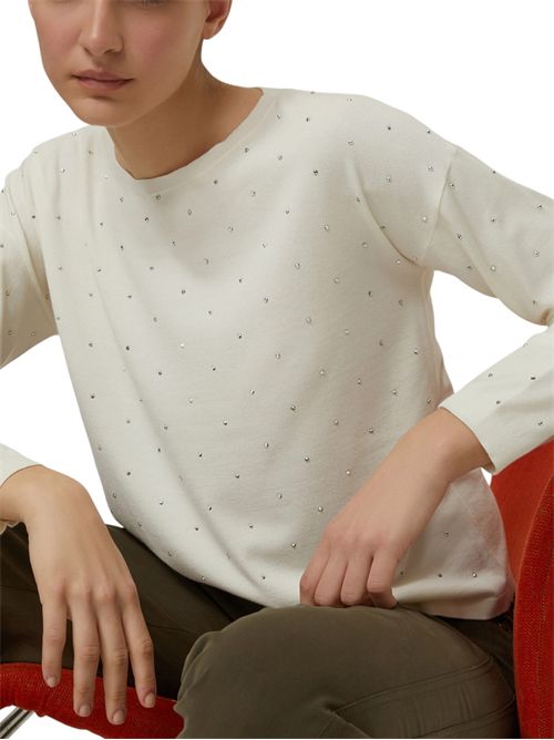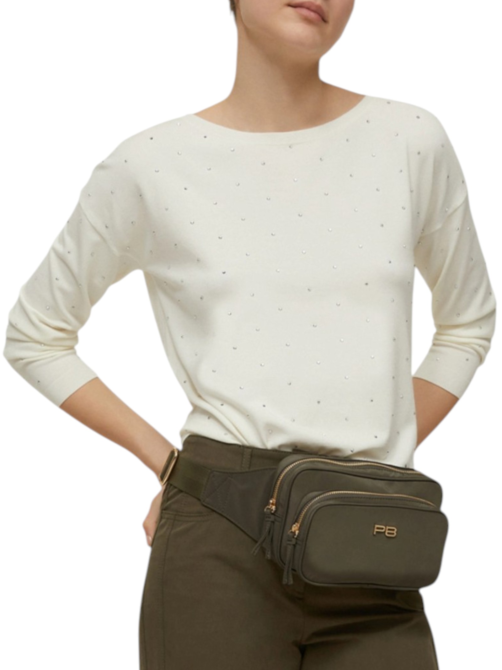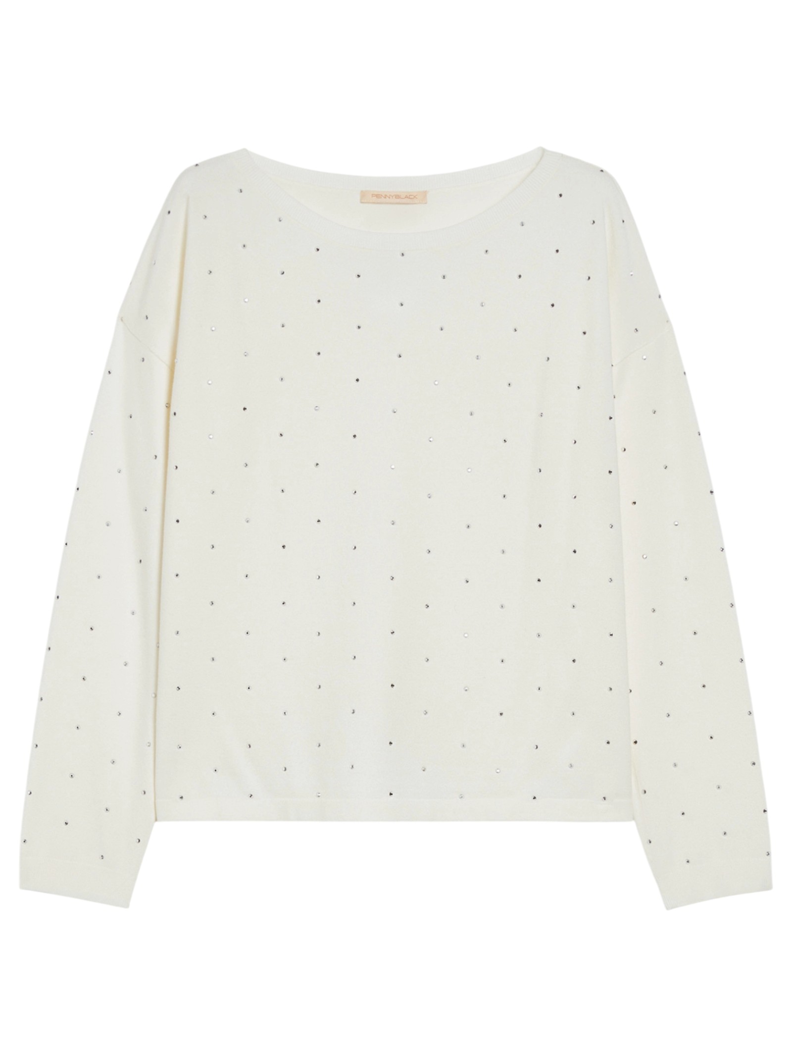 Un pizzico di glamour può dare una svolta al look: ecco la maglia dal design pulito, arricchita da micro-borchie scintillanti.