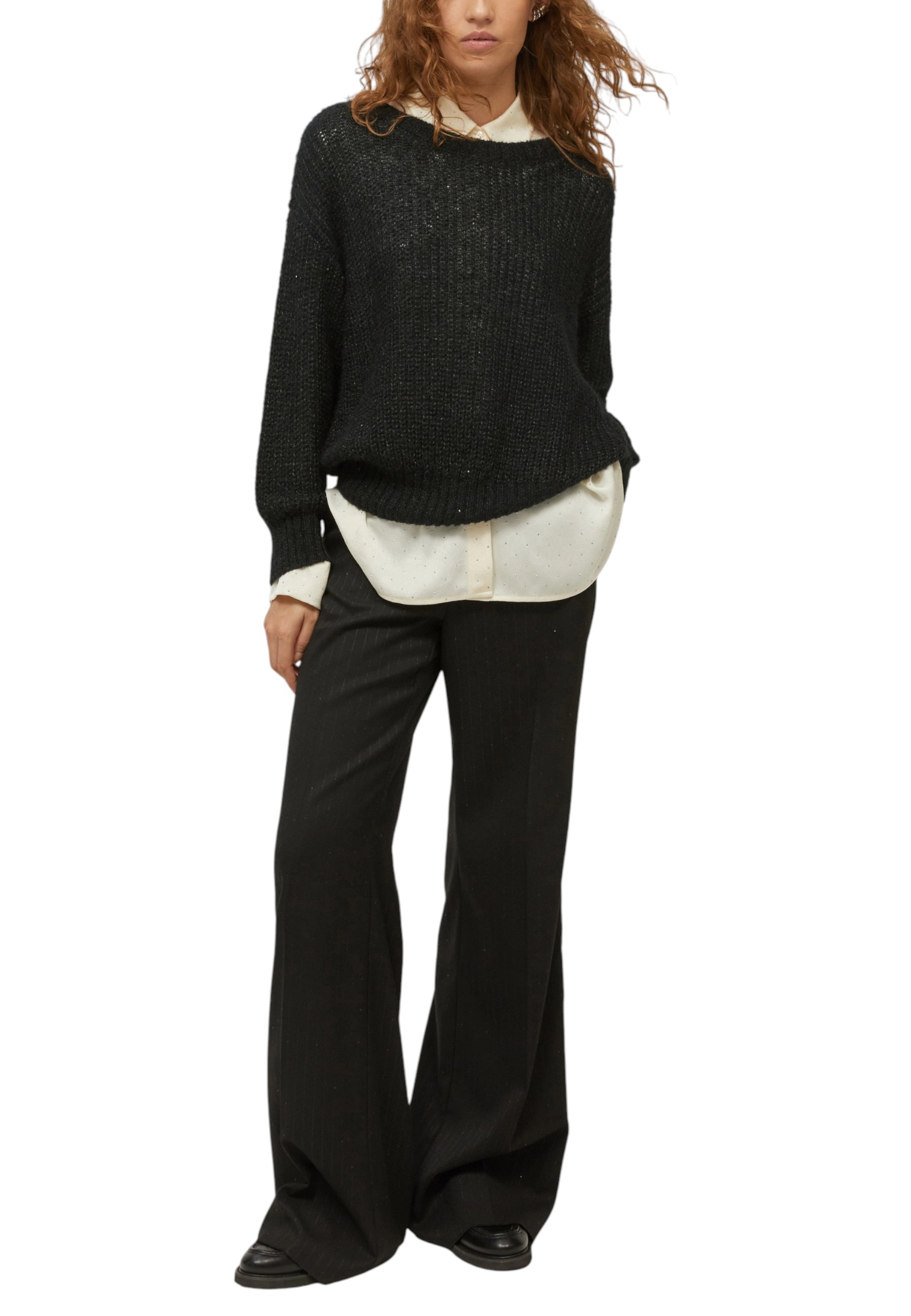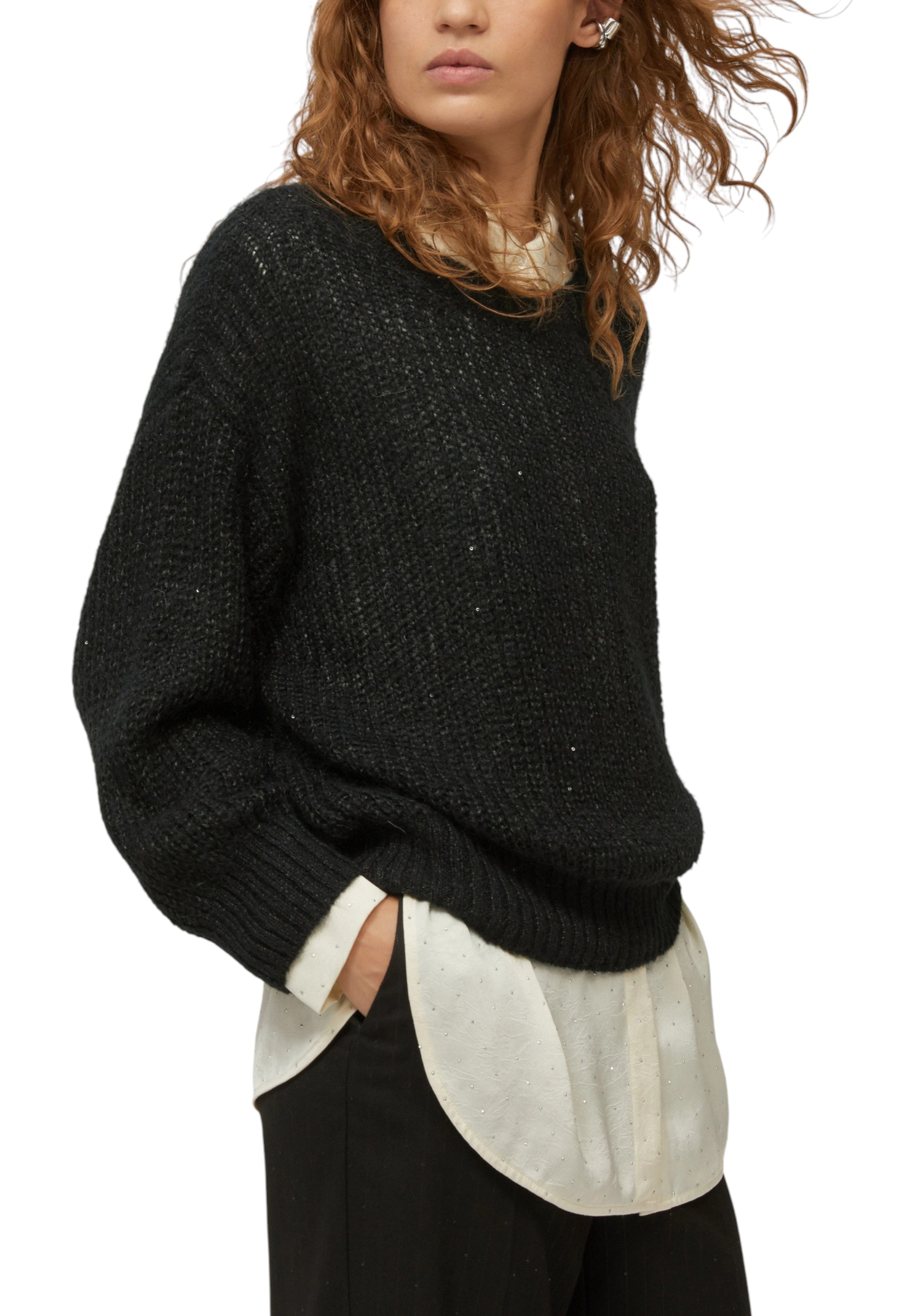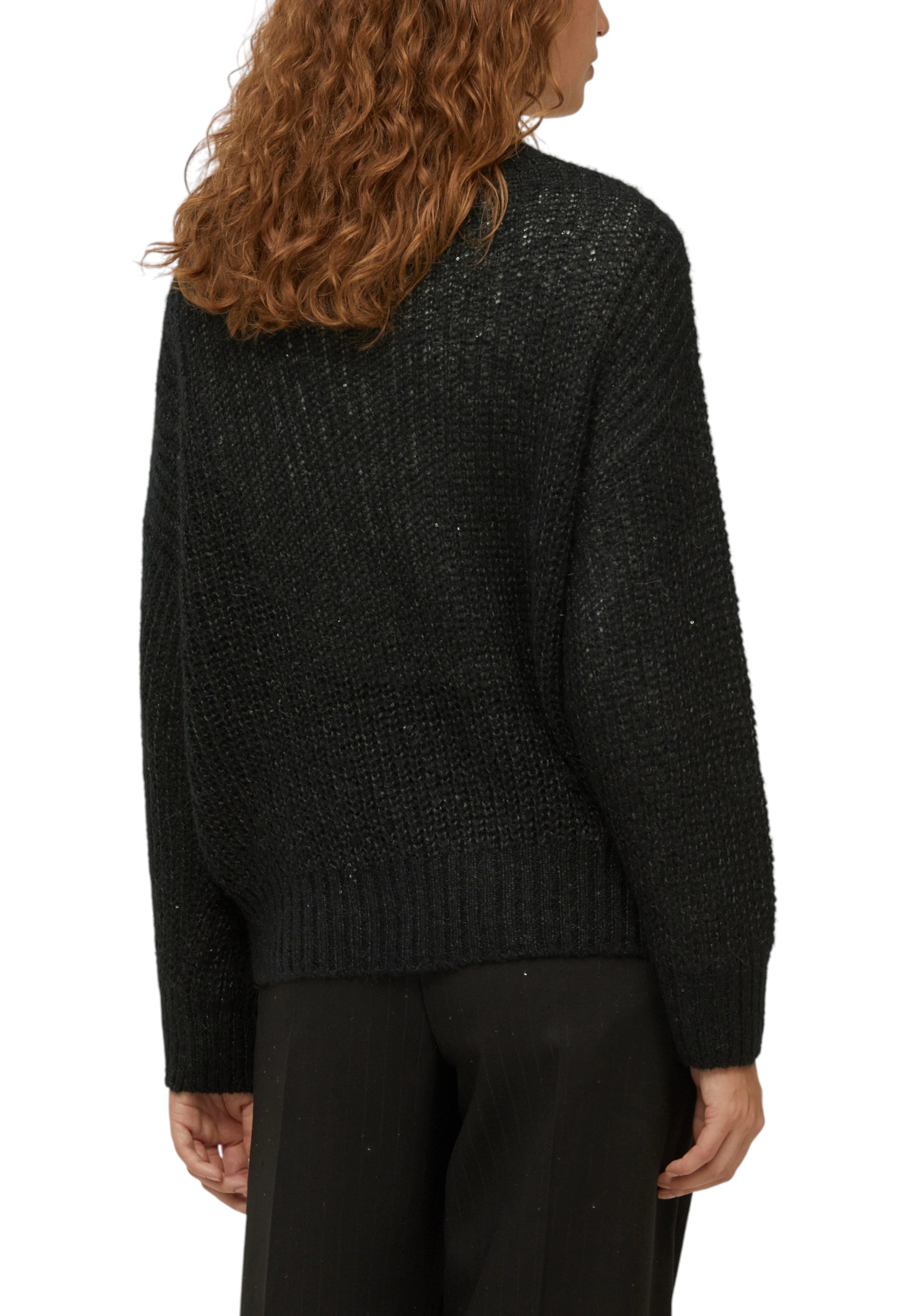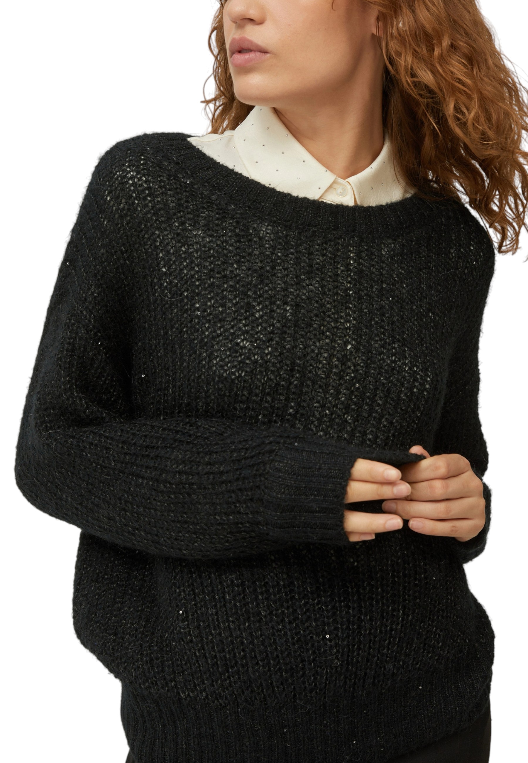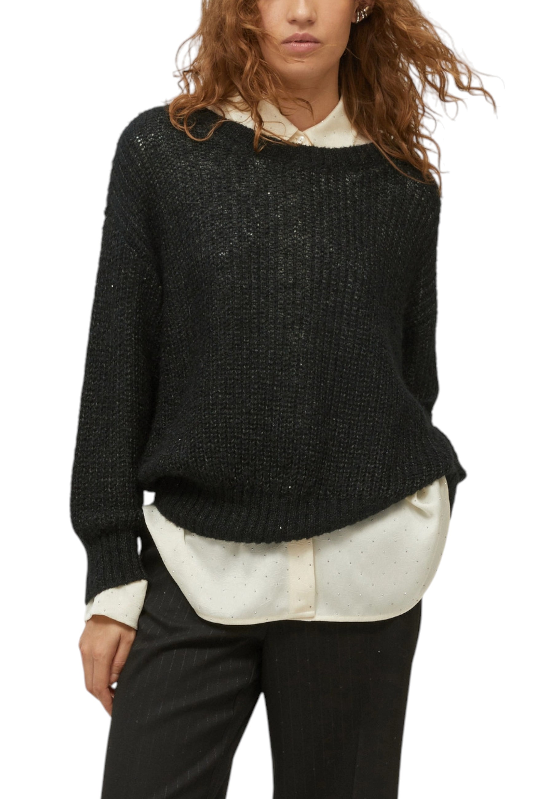 Con trame ariose e delicati bagliori di micro-paillettes, questa maglia reinterpreta in chiave chic una lavorazione dal gusto casual. Sui pantaloni eleganti o sui jeans, sempre perfetta.
