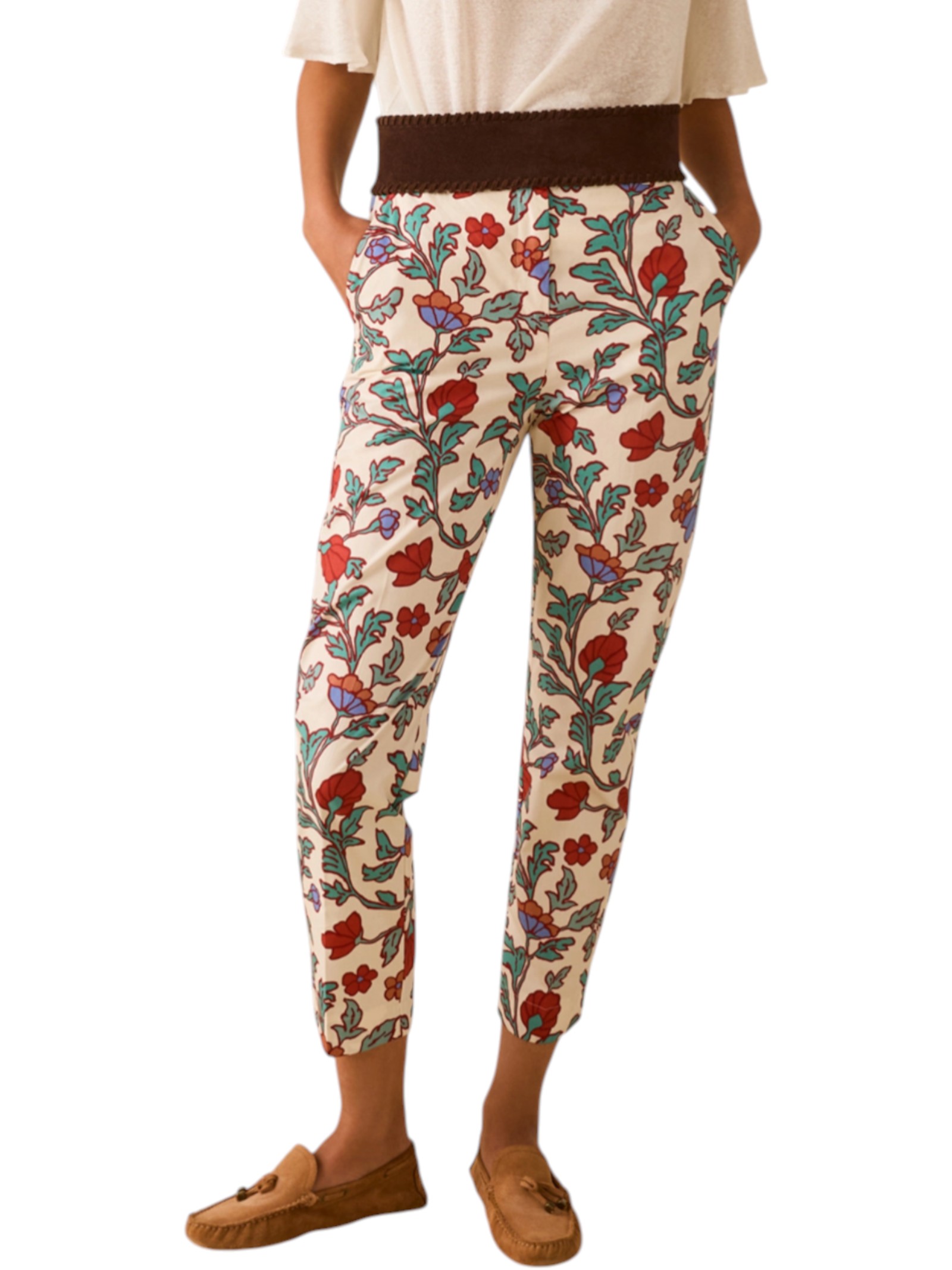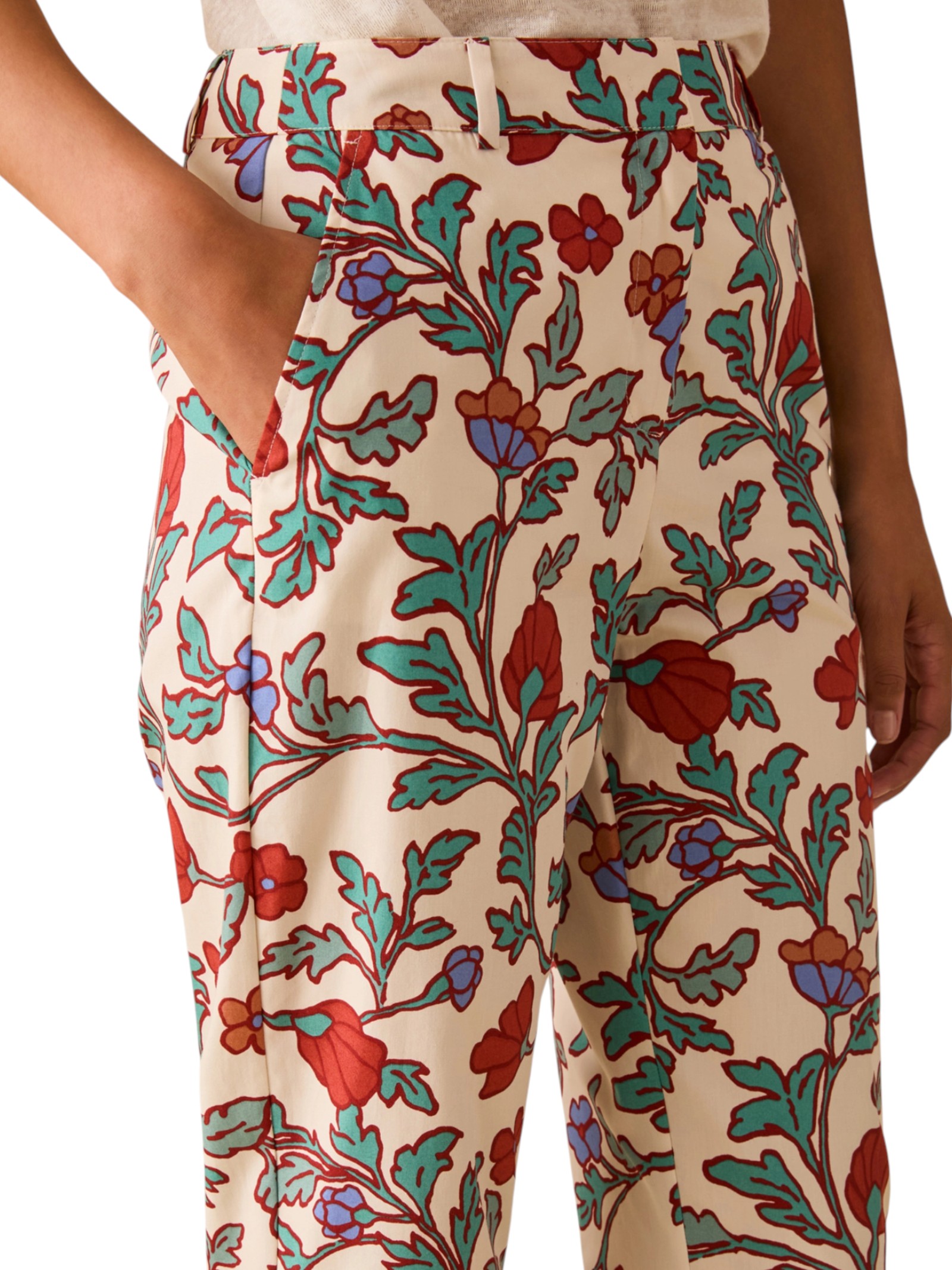 Per freschissimi look estivi, questi pantaloni in popeline sfiorano la silhouette con un taglio impeccabile: carattere vivace a fantasia ramages o passe-partout in tinta unita.
