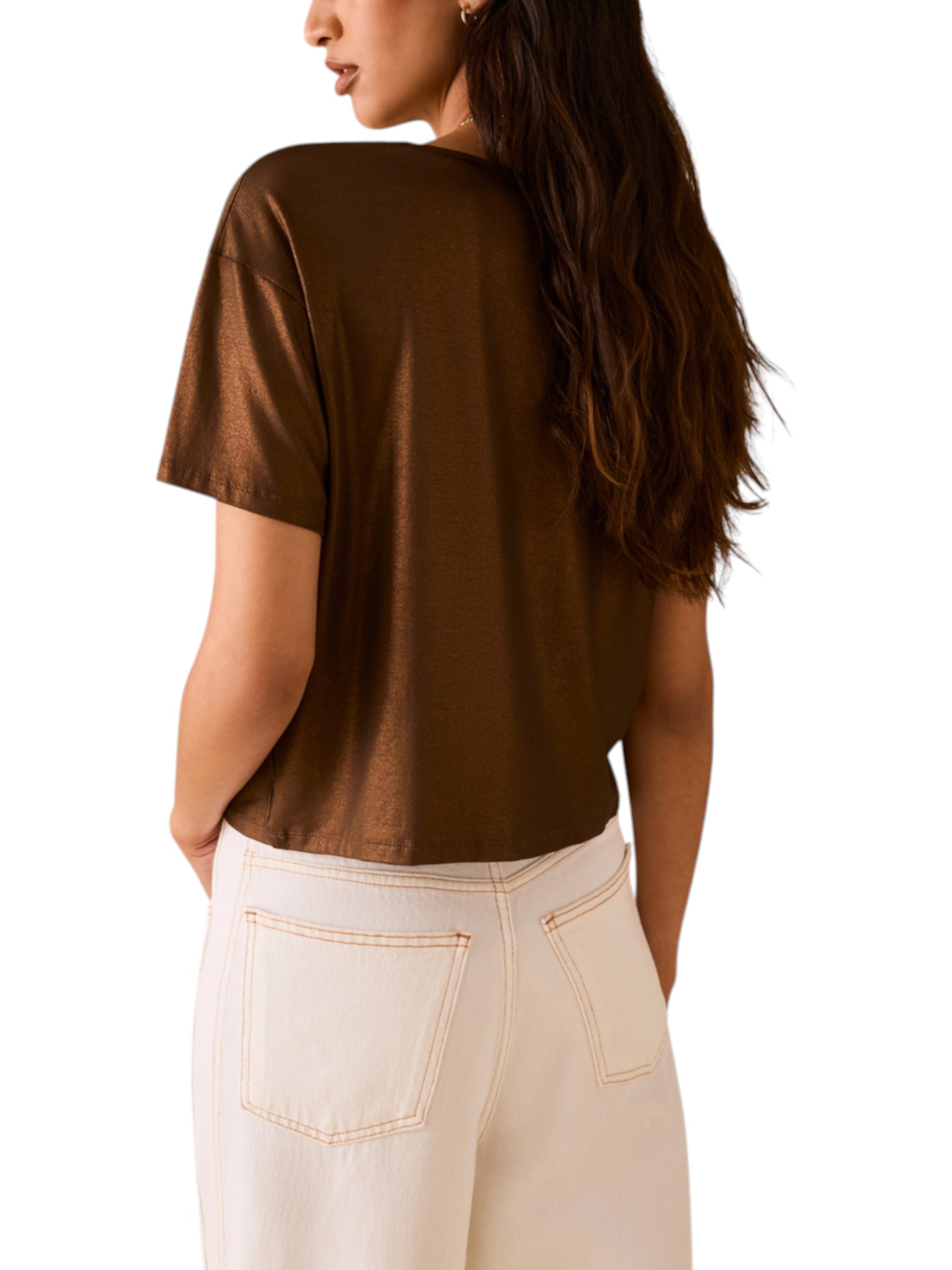 Per i party dal dress code informale o per aggiungere la giusta dose di glamour a un outfit essenziale, ecco la T-shirt dai riflessi laminati.