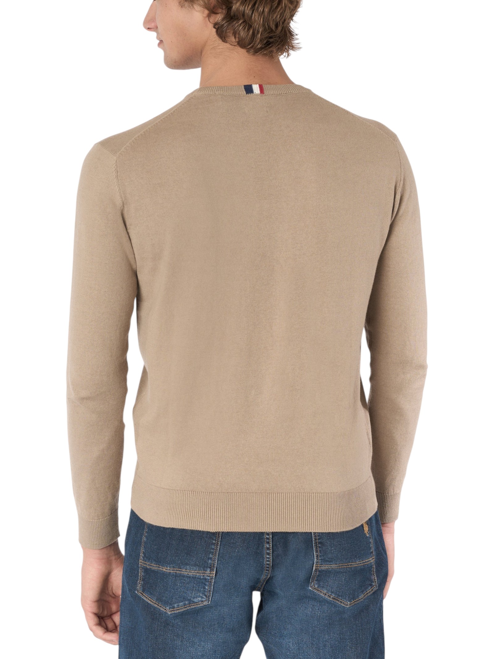 Maglia girocollo da uomo in soffice tessuto cotone e cashmere. Si caratterizz per la vestibilità classica, girocollo raglan e polsini e fondo a costina che consentono una maggiore adattabilità. La bandierina nei tre colori istituzionali sul retro arricchiscino il capo. Il ricamo a filo del logo Double Horsemen lato cuore dona un tocco di eleganza al capo e riflette il legame del brand con lo sport del polo. Un'eleganza senza tempo per un look versatile.