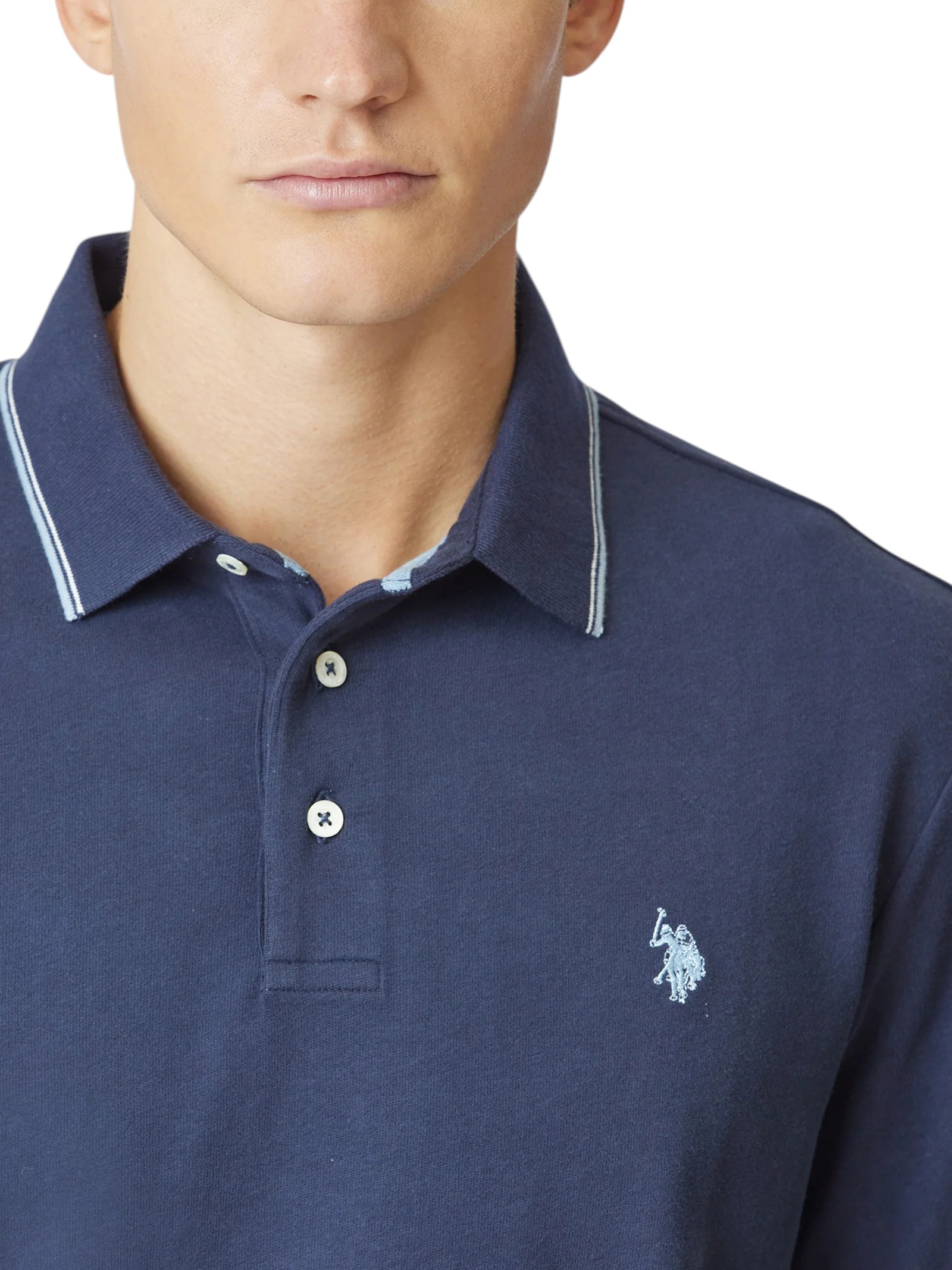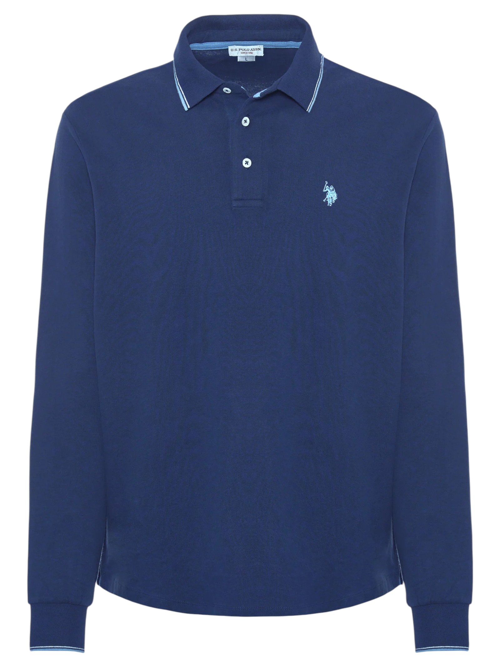 Polo shirt a maniche lunghe da uomo in caldo cotone heavy jersey carbon finishing. Si caratterizza per il motivo rigato su colletto e polsini che arricchisce e dona un tocco raffinato al capo. La chiusura con tre bottoni, i polsini a coste e i piccoli spacchi laterali sull'orlo consentono una maggiore capacità di adattamento e aderenza del capo. Il ricamo a filo del logo Double Horsemen lato cuore contraddsitingue l'iconico capo e riflette il legame del brand con lo sport del polo.