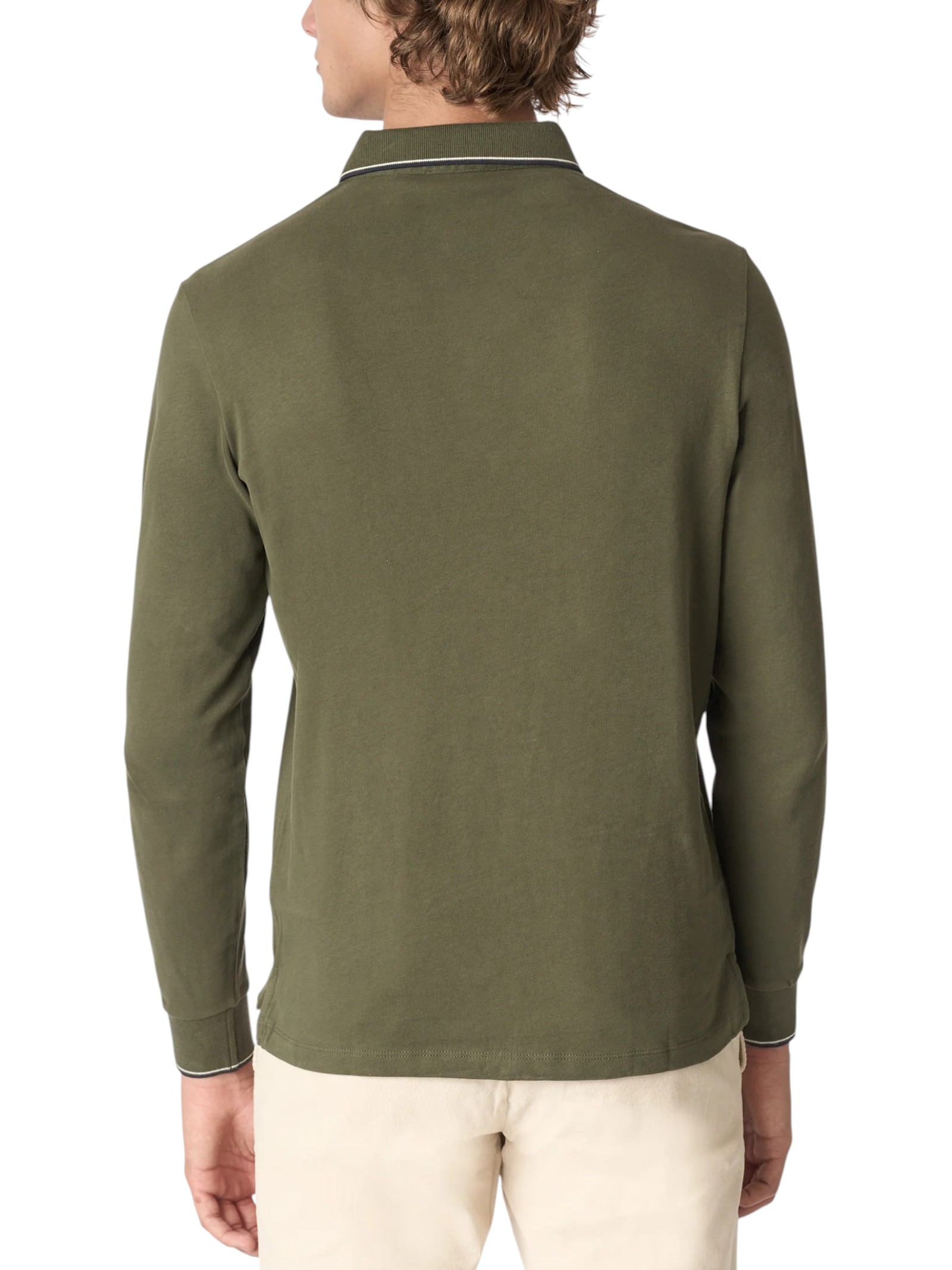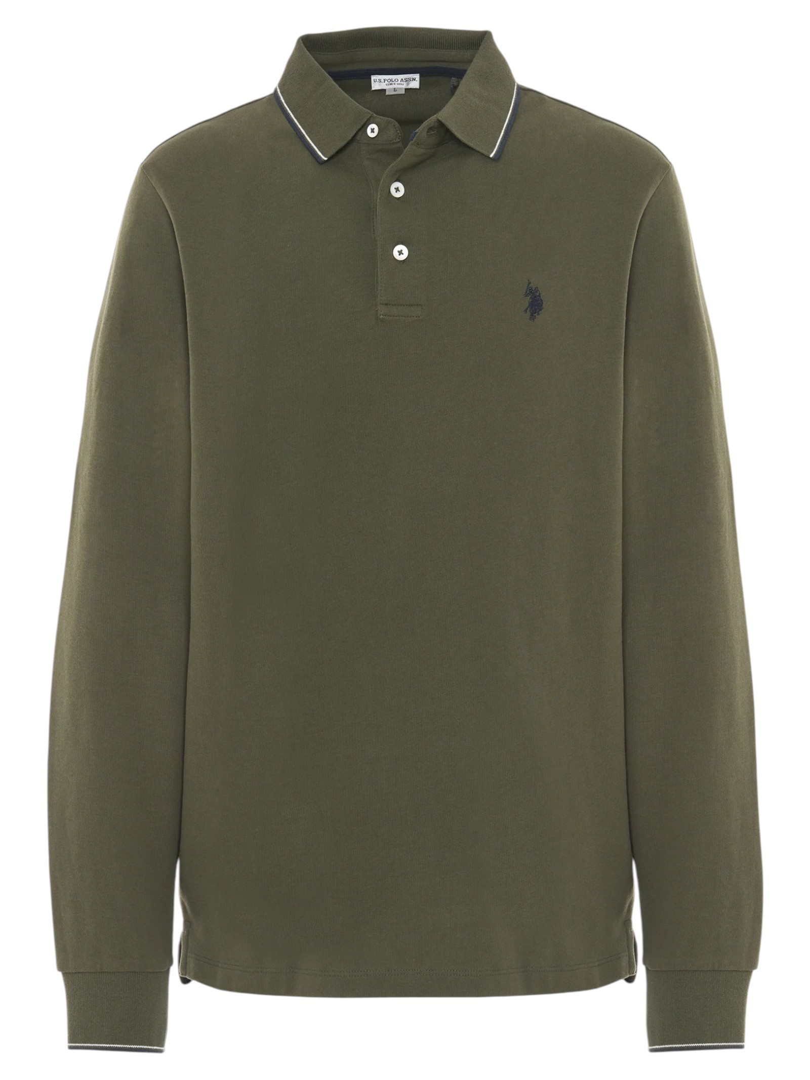 Polo shirt a maniche lunghe da uomo in caldo cotone heavy jersey carbon finishing. Si caratterizza per il motivo rigato su colletto e polsini che arricchisce e dona un tocco raffinato al capo. La chiusura con tre bottoni, i polsini a coste e i piccoli spacchi laterali sull'orlo consentono una maggiore capacità di adattamento e aderenza del capo. Il ricamo a filo del logo Double Horsemen lato cuore contraddsitingue l'iconico capo e riflette il legame del brand con lo sport del polo.
